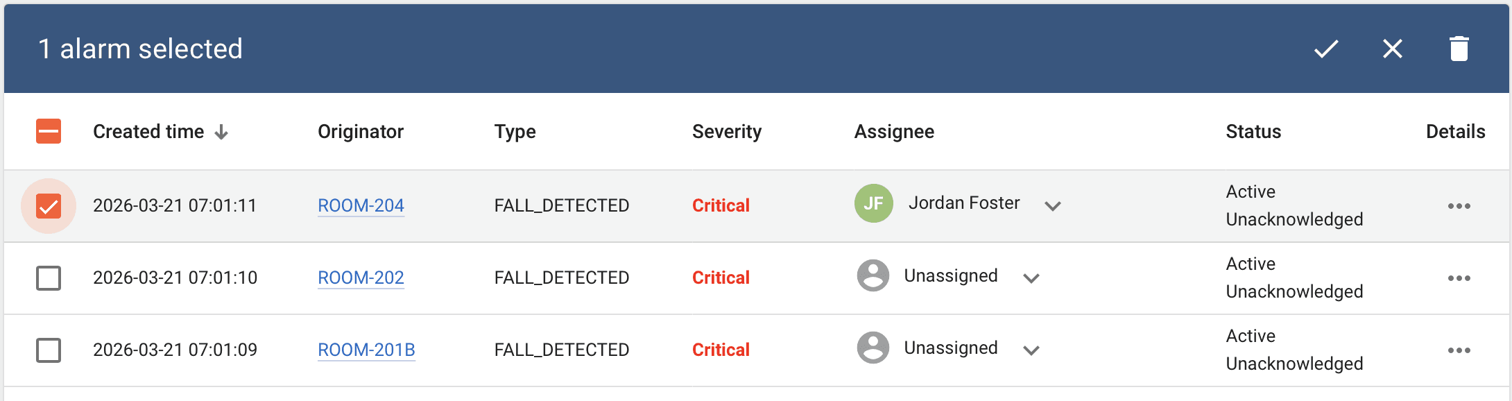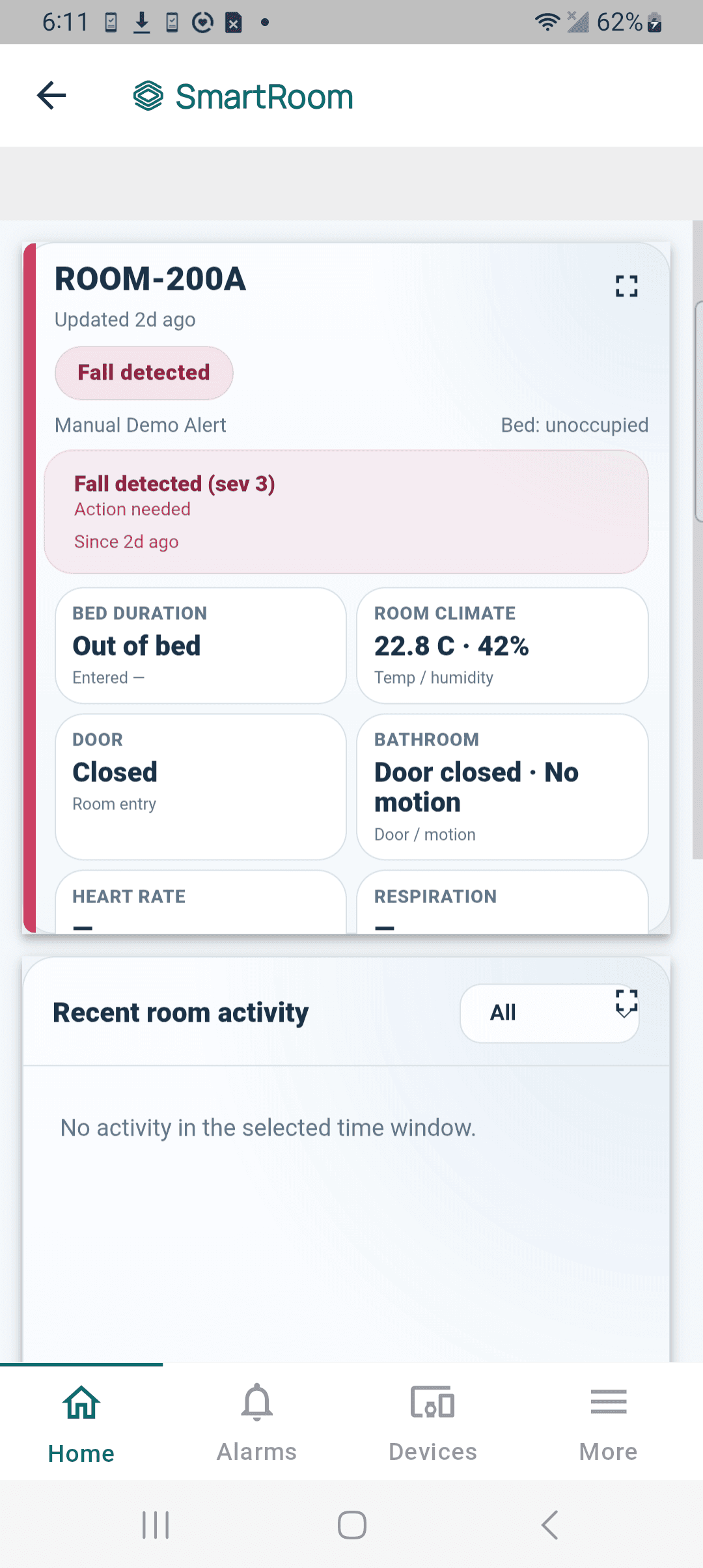 Our central dashboard allows you to see at a glance all rooms and every person, actively monitoring their condition 24/7